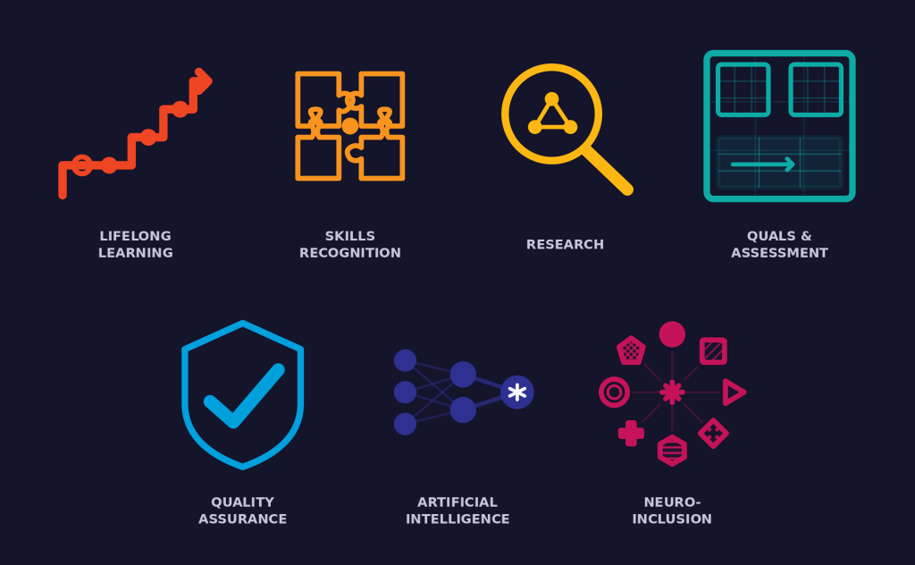 Our work is organised around seven interconnected areas of expertise. Each one represents a distinct capability. In practice, they rarely operate in isolation: a micro-credential project usually involves research, assessment design, and quality assurance; a digital credentialing system needs strategy, implementation, and independent verification. The value we bring is the ability to work across all of them, and to understand how decisions in one area affect outcomes in another.
